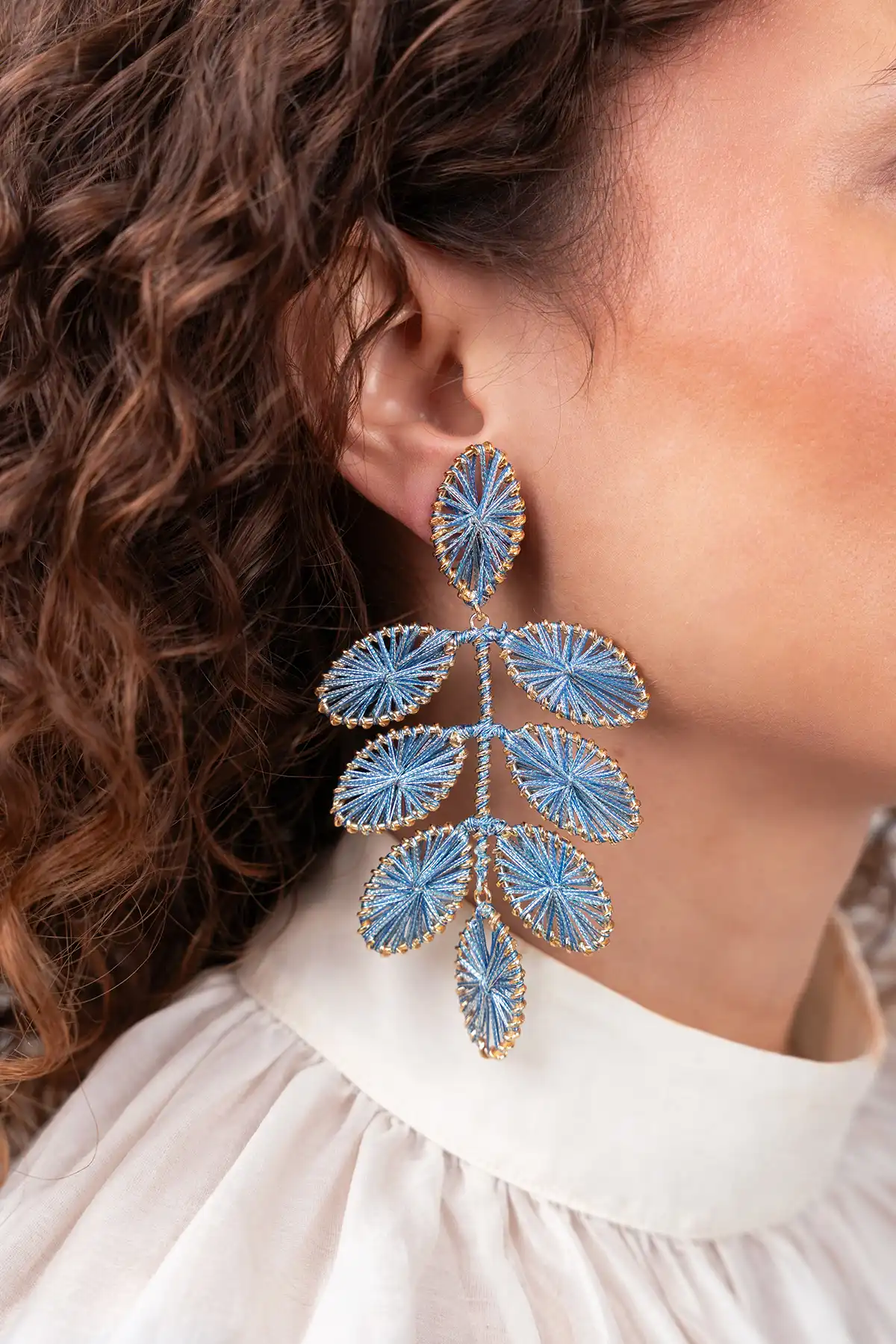 Perfect voor de eerste zonnestralen: de 'Blauwe Oorbellen Flower Leafs XL Beatrice' van LOTT. gioielli. Gemaakt met zijde en verfijnde garens en met een verfijnde afwerking die perfect past bij de sfeer van lente. Met een gemiddeld gewicht zijn deze oorbellen perfect in balans en zichtbaar elegant, onmerkbaar zwaar. Laat je persoonlijkheid bloeien dit voorjaar.