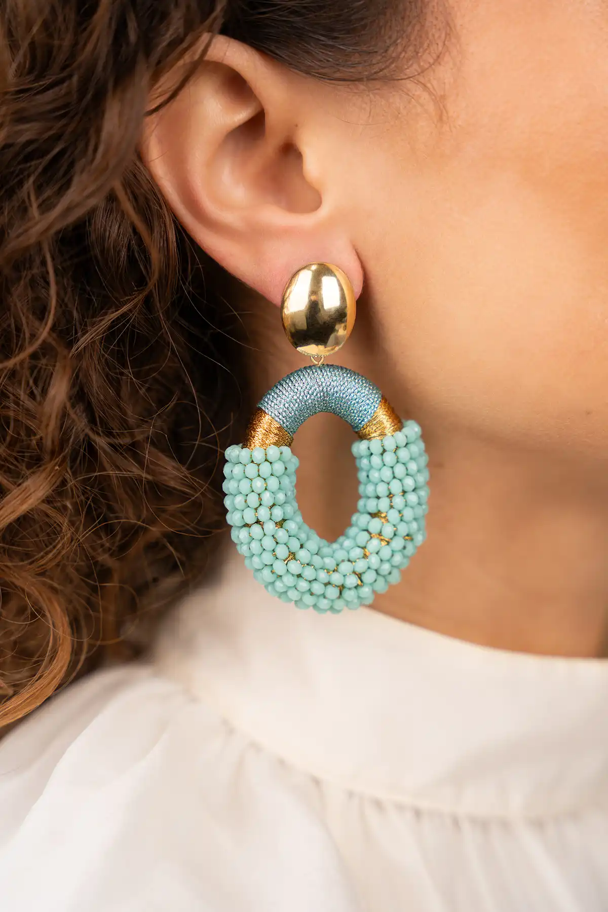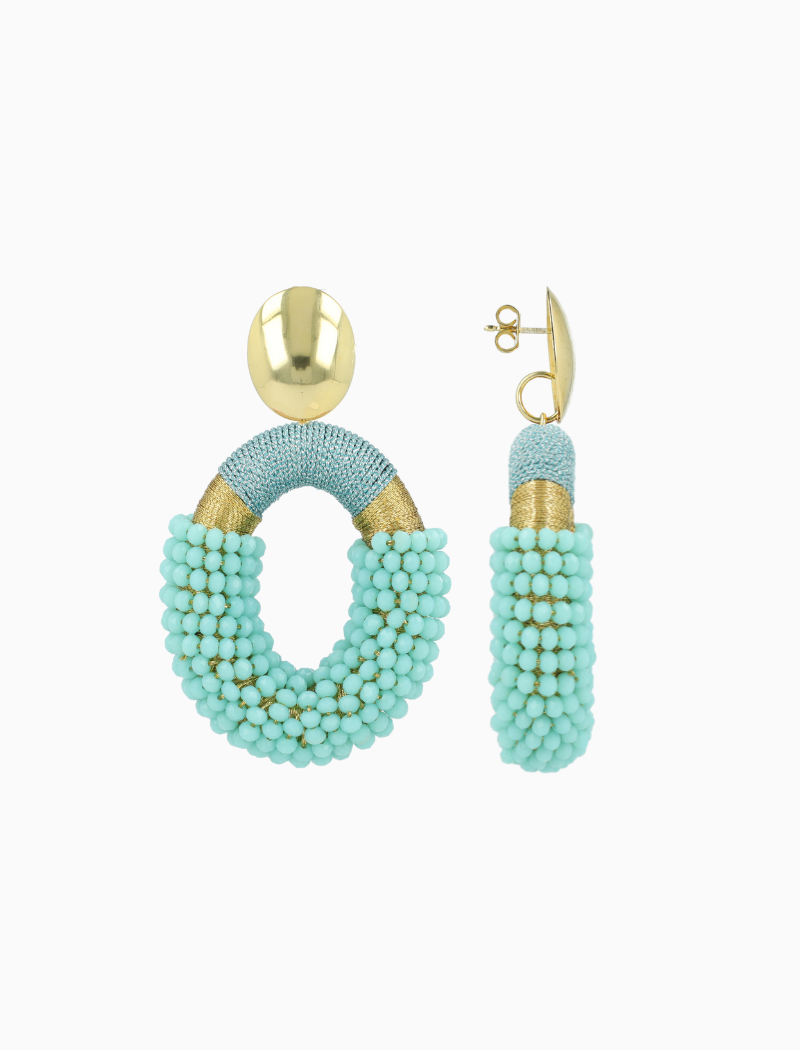 De aquamarijntint van de kralen voegt een verfrissende touch toe aan elke look, of je ze nu draagt bij een chique avondjurk of bij een casual jeans en T-shirt. Hun ovaale vorm en unieke combinatie van materialen maken ze veelzijdig genoeg om te combineren met verschillende outfits, van bohemien chic tot klassiek elegant.