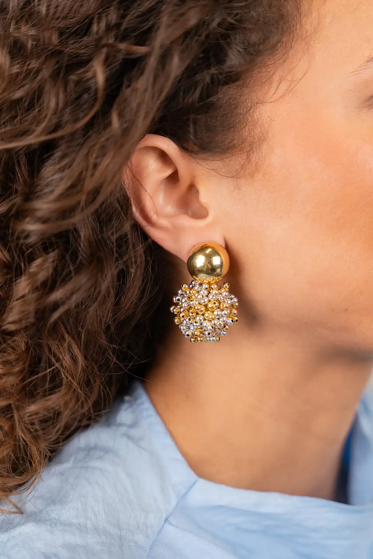 De 'Jacky Globe L Double Stones' in PaarsGoud/zilverkleurig is ontworpen voor zonnige momenten en sprankelende avonden. Vervaardigd uit glassberry kraaltjes, met een verfijnde en herkenbare textuur. Voor een statement look die je echt voelt ‚ gebruik eventueel onze Beauty EarUps voor optimaal comfort. Perfect te dragen bij alles van een linnen jumpsuit tot een feestelijke zomerjurk.