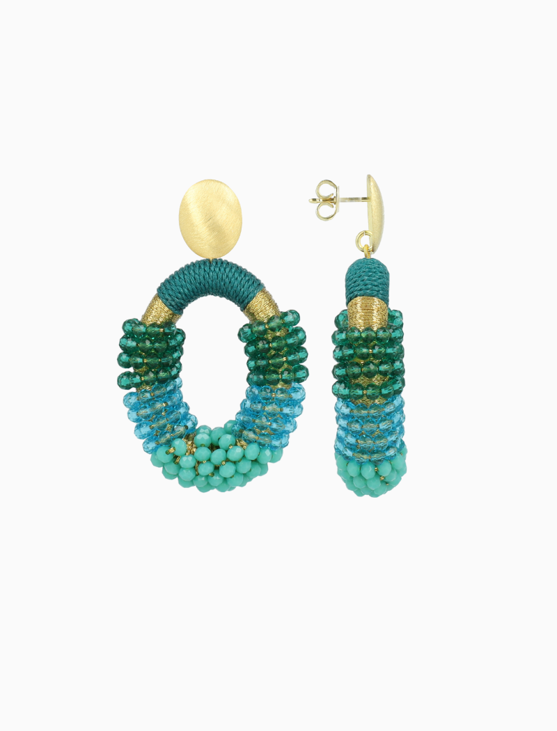 Subtiel, sprankelend en helemaal van nu: de 'Yara Combi Oval M' in Groen. Vervaardigd uit glassberry kraaltjes, met een verfijnde en herkenbare textuur. Ze rusten moeiteloos op je oor, perfect voor dagen vol zon en beweging. Perfect te dragen bij alles van een linnen jumpsuit tot een feestelijke zomerjurk.
