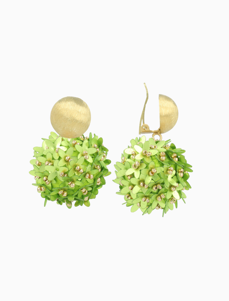 Met hun levendige limoengroene sequins, die als bloemblaadjes rondom de globe zijn gerangschikt, stralen deze oorbellen een jeugdige energie uit die elke outfit zal opvrolijken. De clip-oorbellen zorgen bovendien voor een moeiteloze en veilige bevestiging, waardoor je de hele dag kunt stralen zonder zorgen.