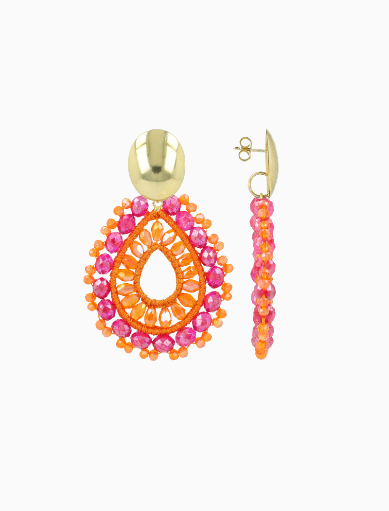 Deze prachtige druppelvormige oorbellen in de trendy oranje en fuchsia kleuren zijn een must-have voor de stijlbewuste vrouwen. De combinatie van zijde draag en glaskraaltjes zorgen voor een moderne twist, waardoor je deze met al je favoriete looks kan combineren. You deserve a LOTT.