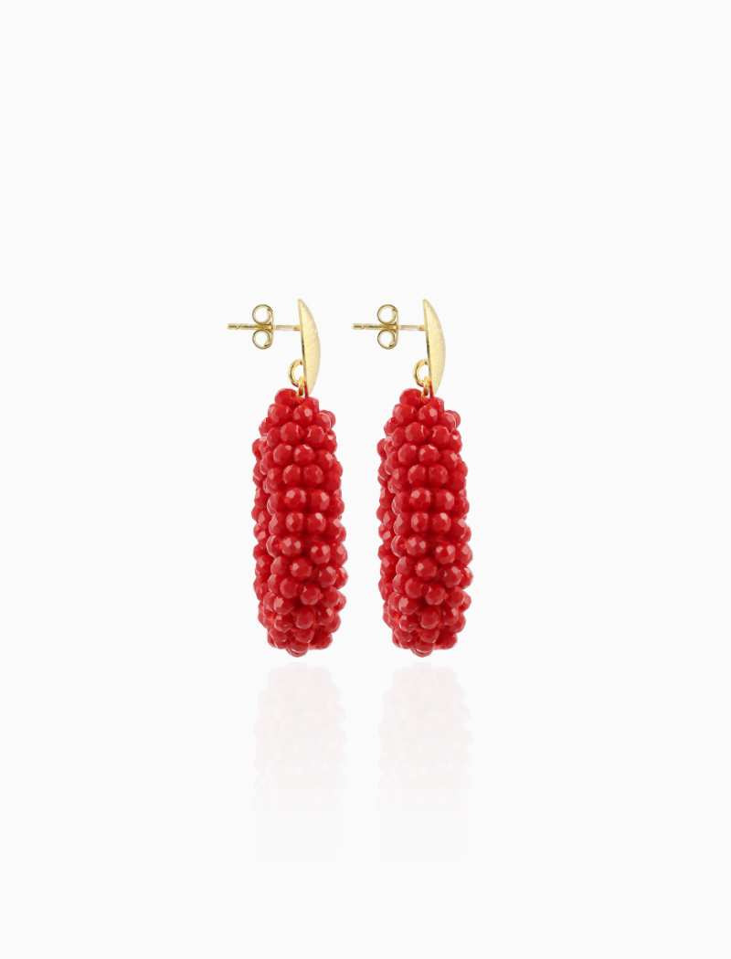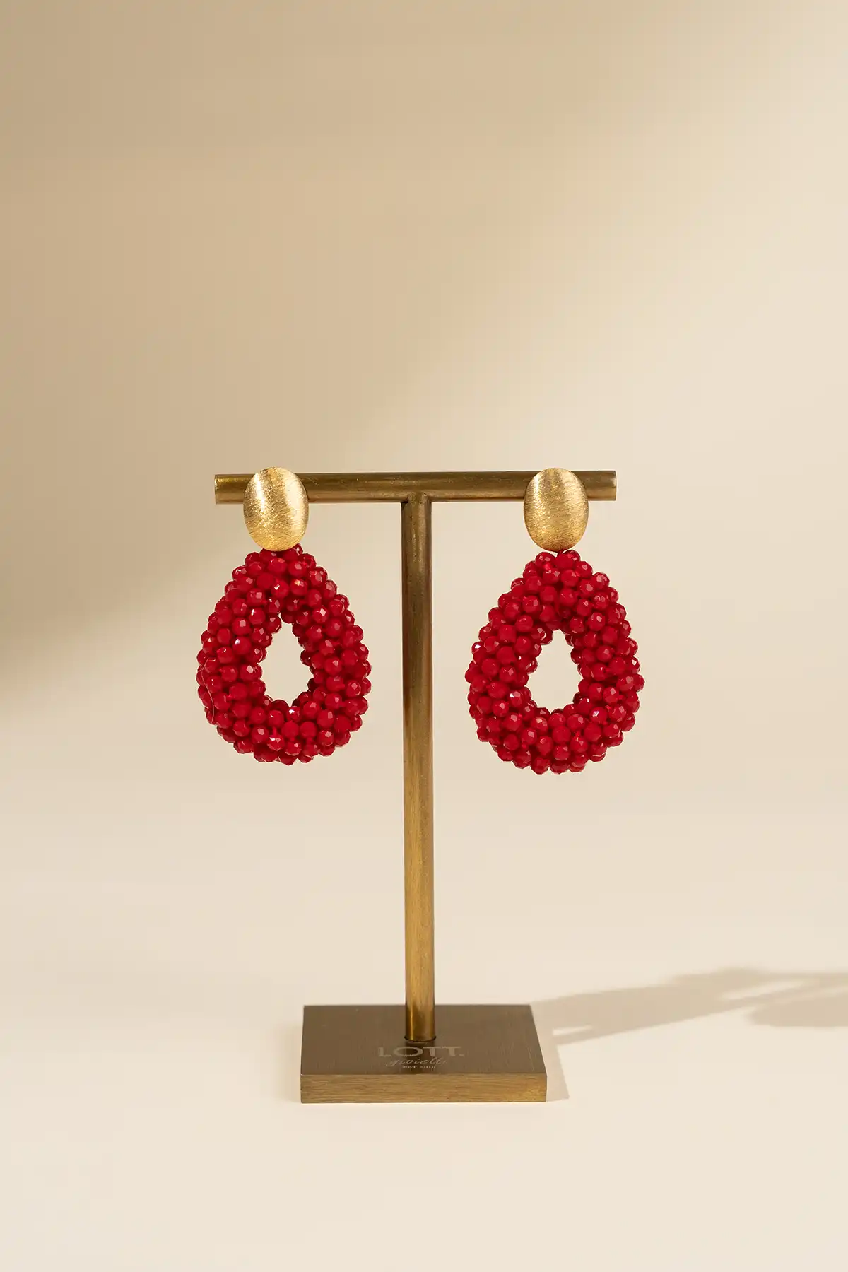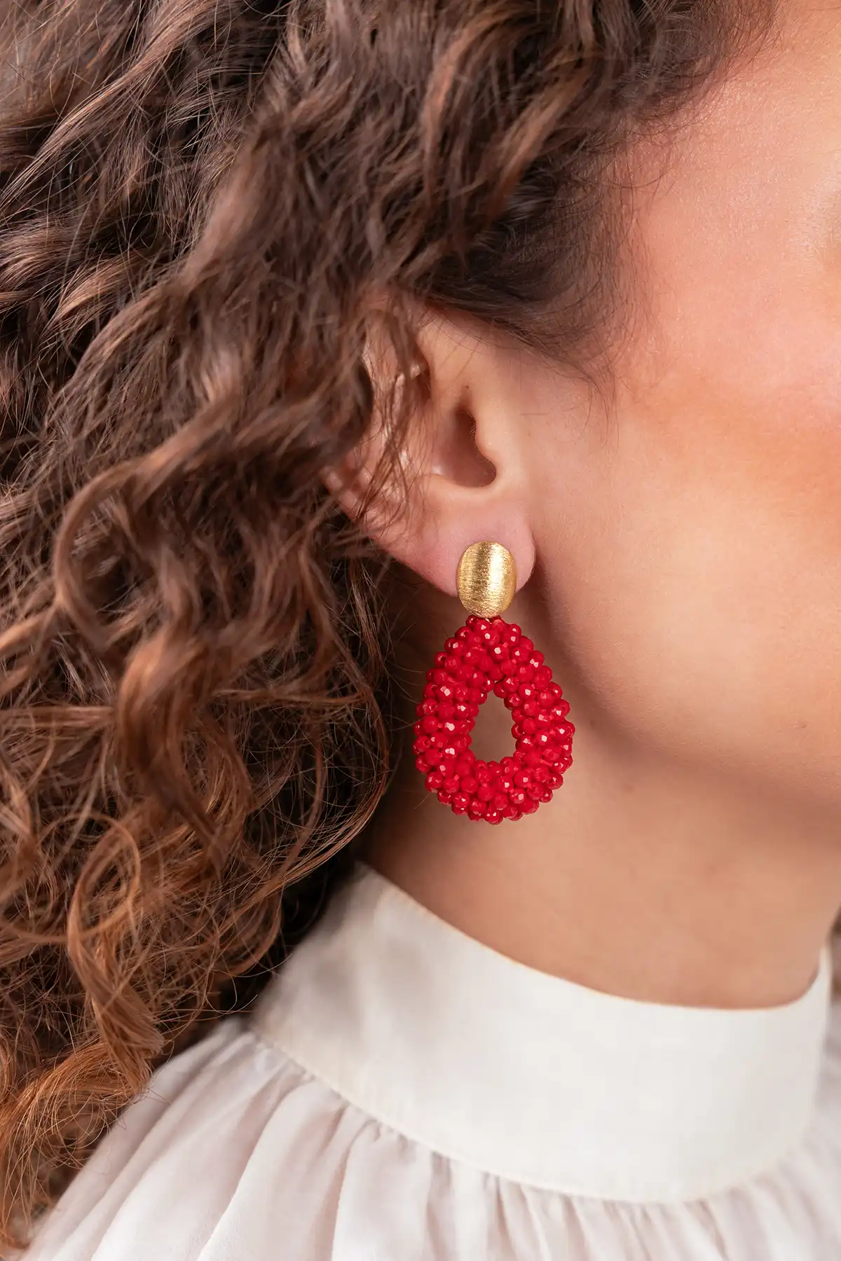 Met hun rijke rode kleur en verfijnde druppelvorm brengen deze oorbellen een elegante dosis flair in je dagelijkse look. De klassieke glaskraaltjes zijn met de hand verwerkt tot een verfijnd ontwerp dat licht en luchtig aanvoelt. Dankzij het lichte gewicht zijn deze oorbellen bijzonder comfortabel om te dragen, ideaal voor een drukke dag vol ontmoetingen of een avond uit.