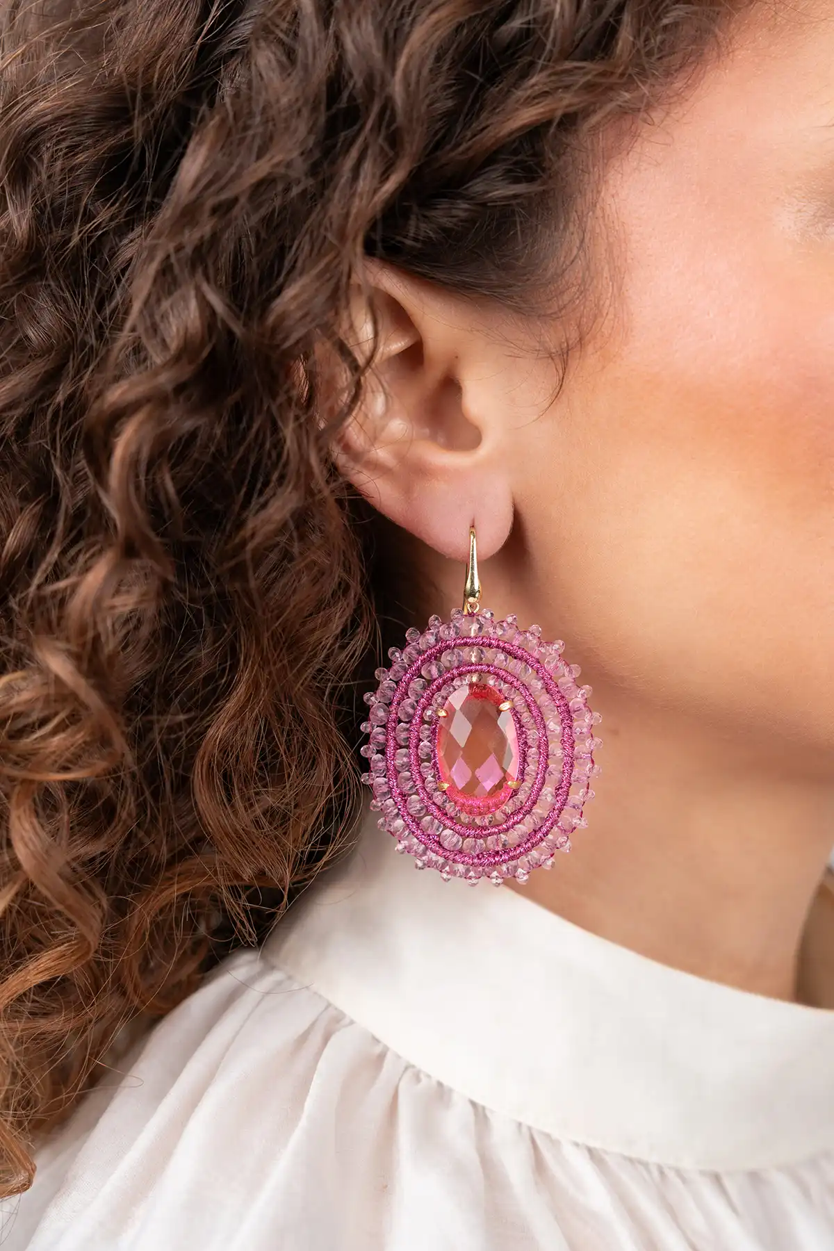Laat je look tot bloei komen met de 'Roze Oorbellen Filled Oval 3 Rings with Stone L Jamie' van LOTT. gioielli. Gemaakt met zijde en verfijnde garens en met een verfijnde afwerking die perfect past bij de sfeer van lente. Met een gemiddeld gewicht zijn deze oorbellen perfect in balans en zichtbaar elegant, onmerkbaar zwaar. Een musthave voor lente.
